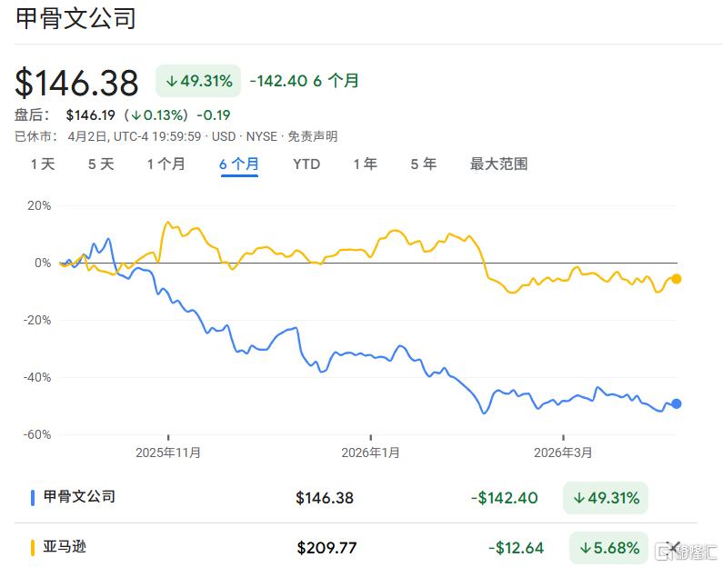 过去6个月,因华尔街的AI泡沫担忧,甲骨文股价累计下跌近50%,亚马逊小幅跌超5%。