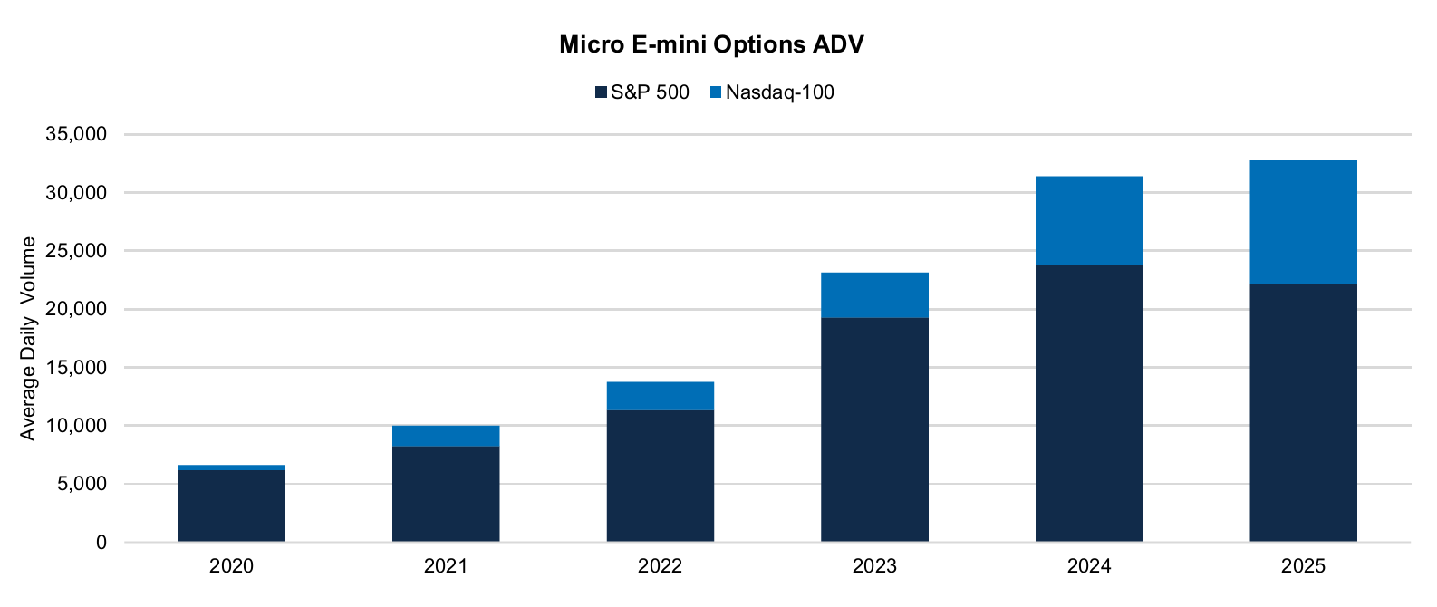 例如,投资者若持有较多科技股,由于科技股对市场波动和利率变化更为敏感,持仓亏损风险相对较高,此时便可买入追踪纳指的看跌期权进行对冲。当市场出现下跌、科技股组合产生亏损时,看跌期权的盈利可部分抵消股票组合的亏损,为资产提供可靠的下行保护,最大程度降低损失。类似的美股股指期权,以芝商所为例,针对标普500指数和纳斯达克100指数两项指数的期权合约,就有标准合约和微型合约两种规模,而期限也有季度合约、月度合约和每周合约,投资者可以灵活地运用不同合约以配合交易需要。参考芝商所的交易数据,这两项美股指数的微型期权合约去年的日均交易量(ADV)达到33000张合约,同比增加4%。(下图),可见投资者面对高波动、高不确定性的市场环境,更需要期权这种工具来管理风险。