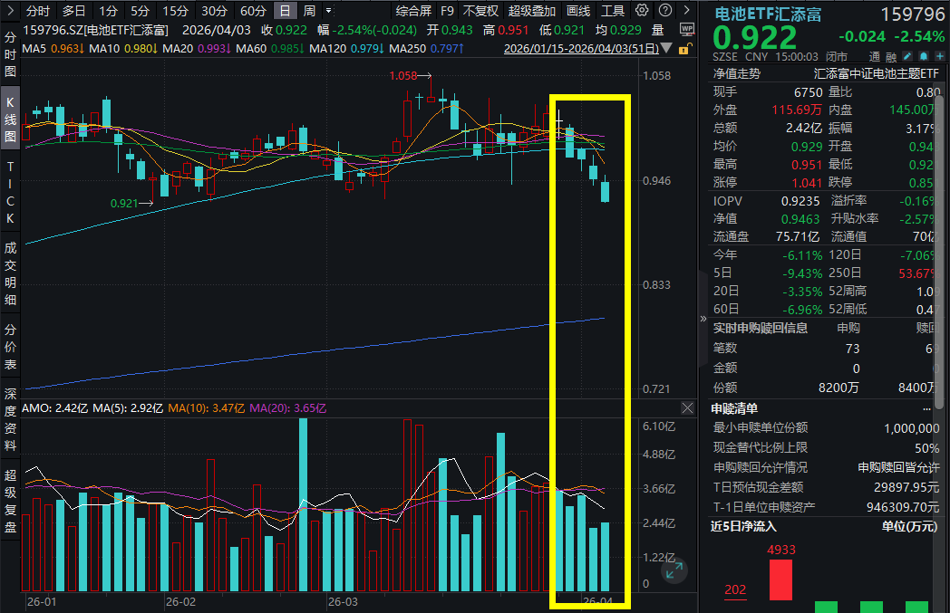4月3日,A股市场震荡,两市超4700股回调,电池板块承压,截至15:00,同类规模领先、费率最低档的电池ETF汇添富(159796)小幅回升但回落,收跌2.54%,弱势五连阴。
