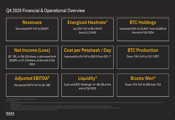 就在2月份宣布转型消息的同时,MARA也公布了2025年第四季度业绩:尽管运营有所改善,但仍出现巨额亏损。