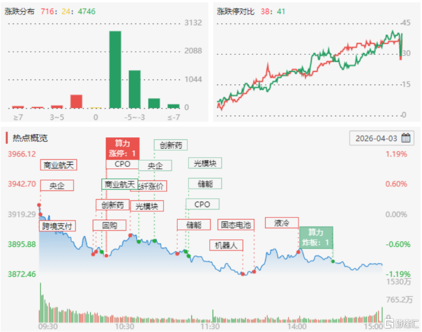 4月3日,沪指跌1%报3880点,深证成指跌0.99%,创业板指跌0.73%。全市场成交额1.67万亿元,超4700股下跌。光刻机、CPO板块涨幅居前;煤炭、油气、养殖业板块下跌。