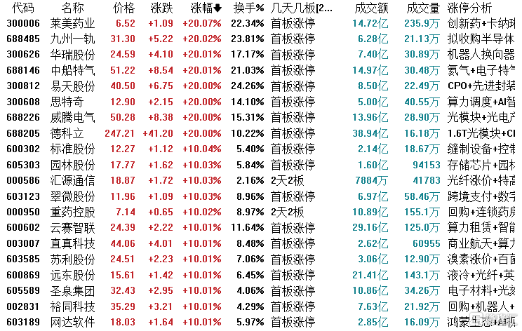 连板股方面,新能泰山9天7板,津药药业6连板,重药控股、汇源通信等2连板,云赛智联、裕同科技等涨停。