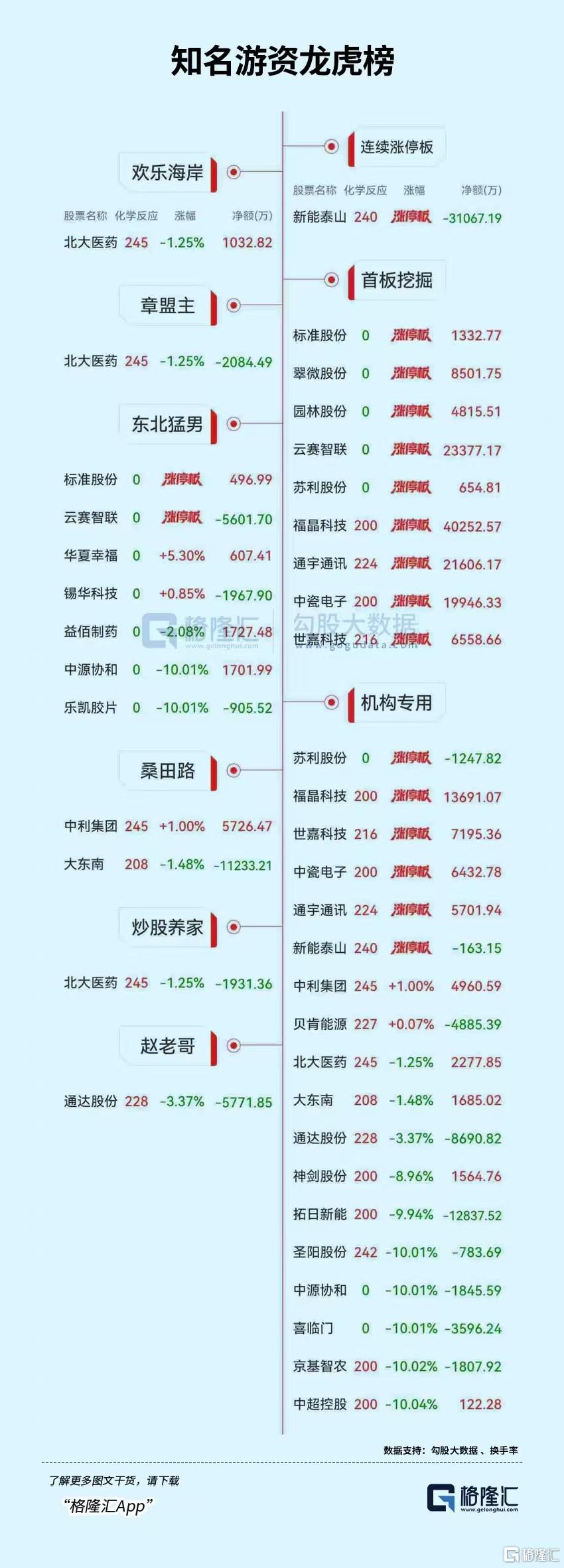 龙虎榜单日净卖出额前三为中超控股、中利集团、新能泰山,分别为5.77亿元、3.25亿元、3.11亿元。