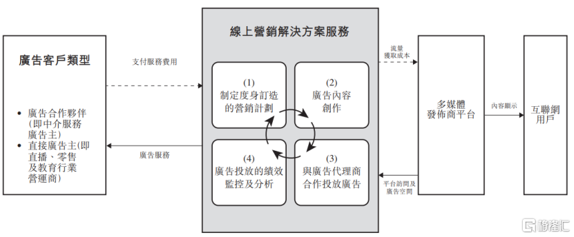 公司向广告客户提供线上营销解决方案服务,以优化其广告投放,并通过在各种媒体平台上进行广告及流量获取增加曝光率。