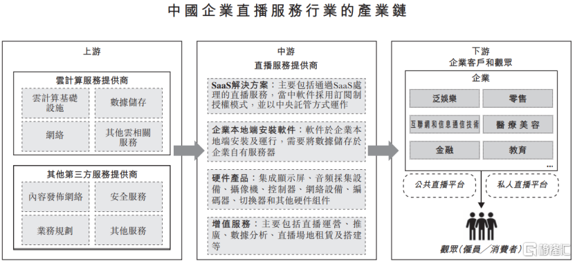 中国企业直播服务产业链上游包括云技术服务提供商及其他第三方服务提供商,参与者包括阿里云、腾讯云、华为云、索尼、云犀等。