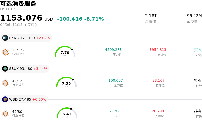 星巴克 (SBUX) 盘中上涨3.44%, 所属行业可选消费服务下跌8.71% ,公司涨幅跑赢行业涨幅,行业成交额前三股票 缤客 (BKNG) 上涨 2.04%;星巴克 (SBUX) 上涨 3.44%;华纳兄弟探索公司 (WBD) 上涨 0.60%。