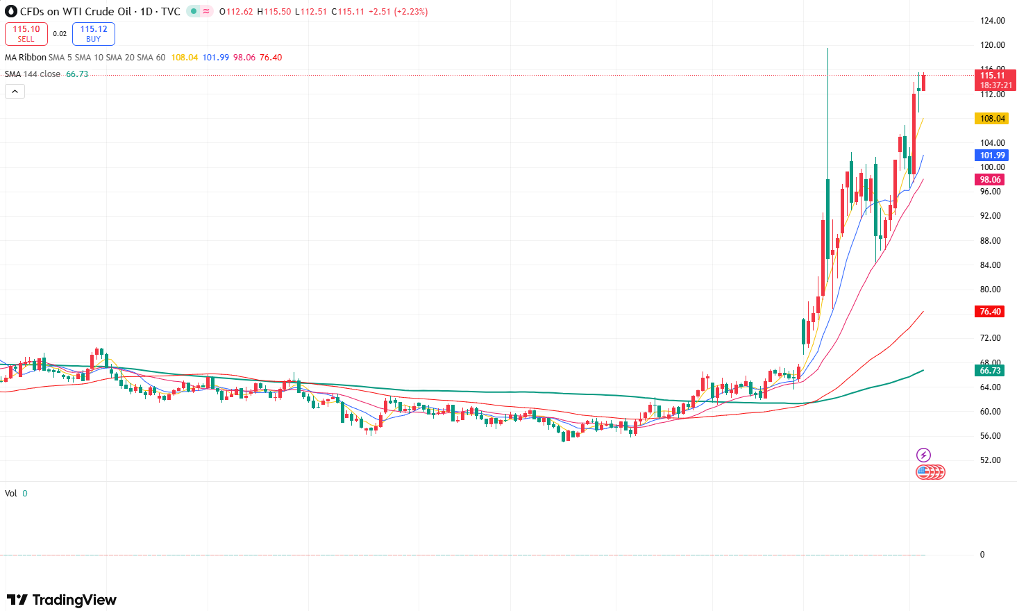 从市场表现来看,OPEC 的决定并未改变油价的上行趋势。截至发稿前,WTI原油价格持续向上测试115美元关口,日内维持涨势,显示资金更倾向于交易风险溢价,而不是供需关系。