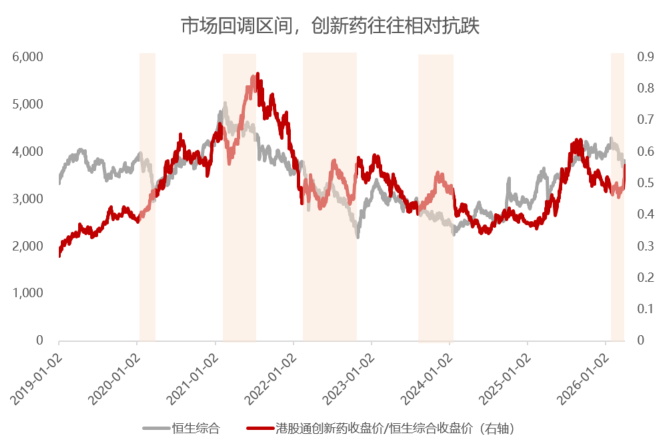 从历史经验来看,在市场系统性调整阶段,创新药板块往往表现出较强的相对收益,即“防御属性”。作为生物医药细分行业,创新药需求具有较高刚性。同时,创新药的产业逻辑一定程度上独立于宏观周期,当风险敏感型板块资金出逃时,创新药因其筹码结构稳定且具备远期想象空间,反而容易成为资金的避风港,呈现出“逆势抗跌”的特征