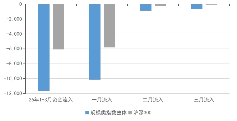 更关键的信号出现在周度数据上:3月前两周,规模类指数流出394亿、258亿后,第三周首度转正,净流入89.5亿元。尽管第四周仍小幅流出,但相较年初动辄千亿的失血速度,已是天壤之别。