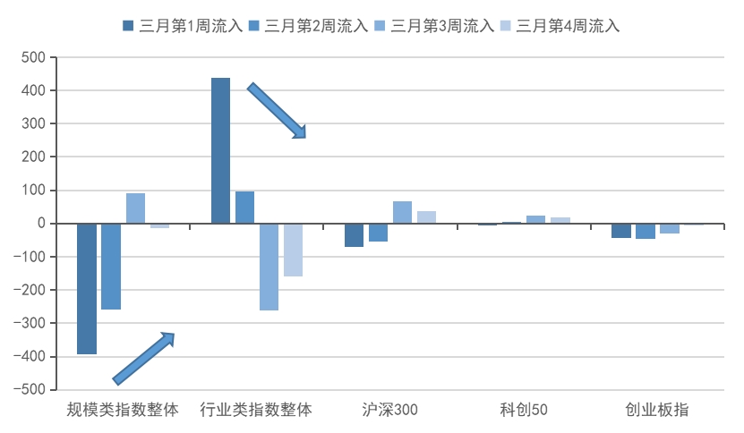 图:行业指数3月呈流出态势;规模指数呈流入态势(单位:亿元)