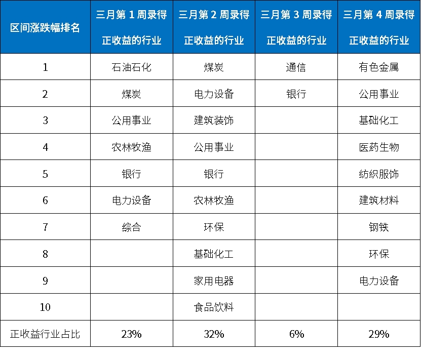 表:3月行业轮动速度快,每周录得正收益的行业少