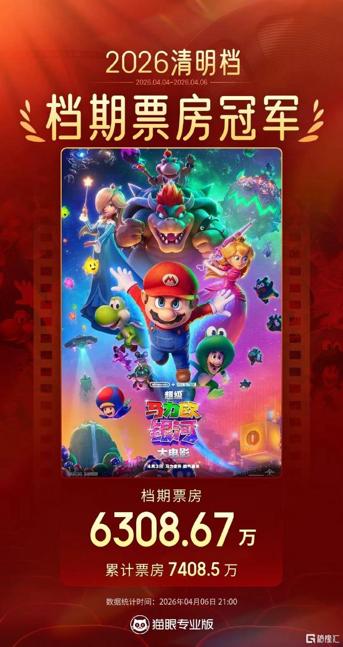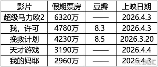 其中,票房前三名的影⽚分别是《超级马力欧银河大电影》、《我,许可》、《挽救计划》。