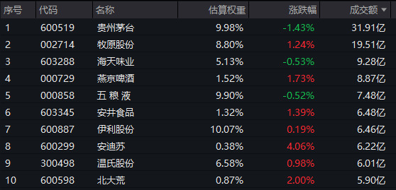 受业绩催化,燕京啤酒今日再度涨近2%,安迪苏涨超4%,北大荒涨超2%,牧原股份、安井食品涨超1%;下跌方面,贵州茅台跌超1%,海天味业、五粮液微跌(指数成分股仅做展示,不作为个股推介)。