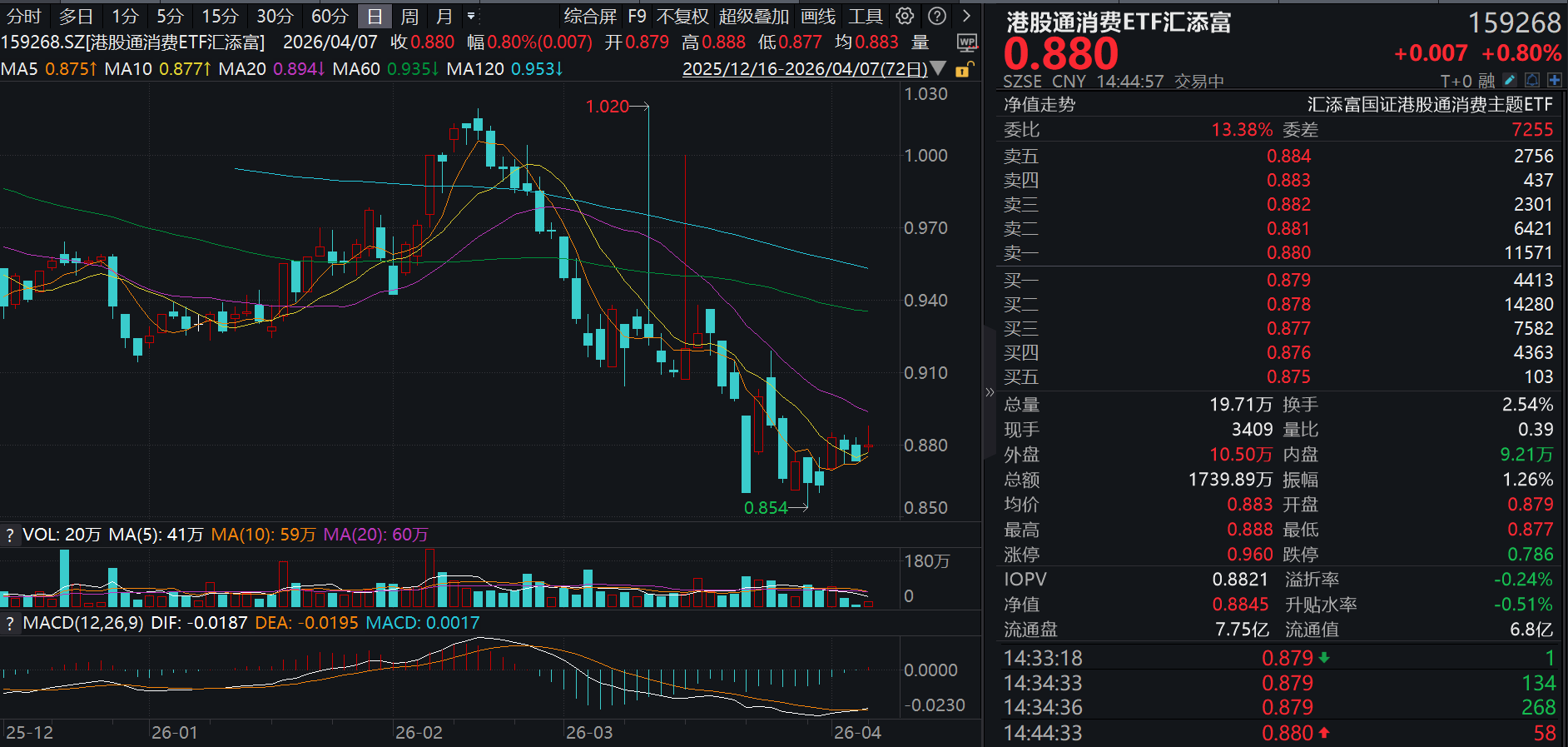 港股今日因节假日休市,聚焦纯正新消费的港股通消费ETF汇添富(159268)涨近1%。