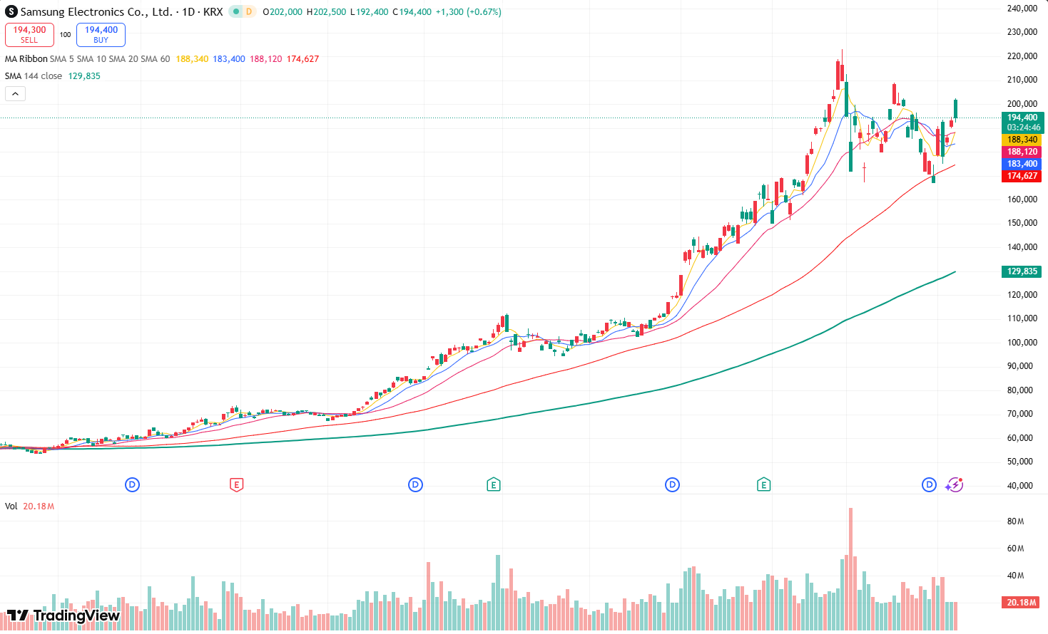 消息公布后,三星股价早盘今开盘跳空高开至202000韩元,但随后回落至最低192400韩元附近,盘中区间为192400至202500韩元,走出典型的高开低走走势。