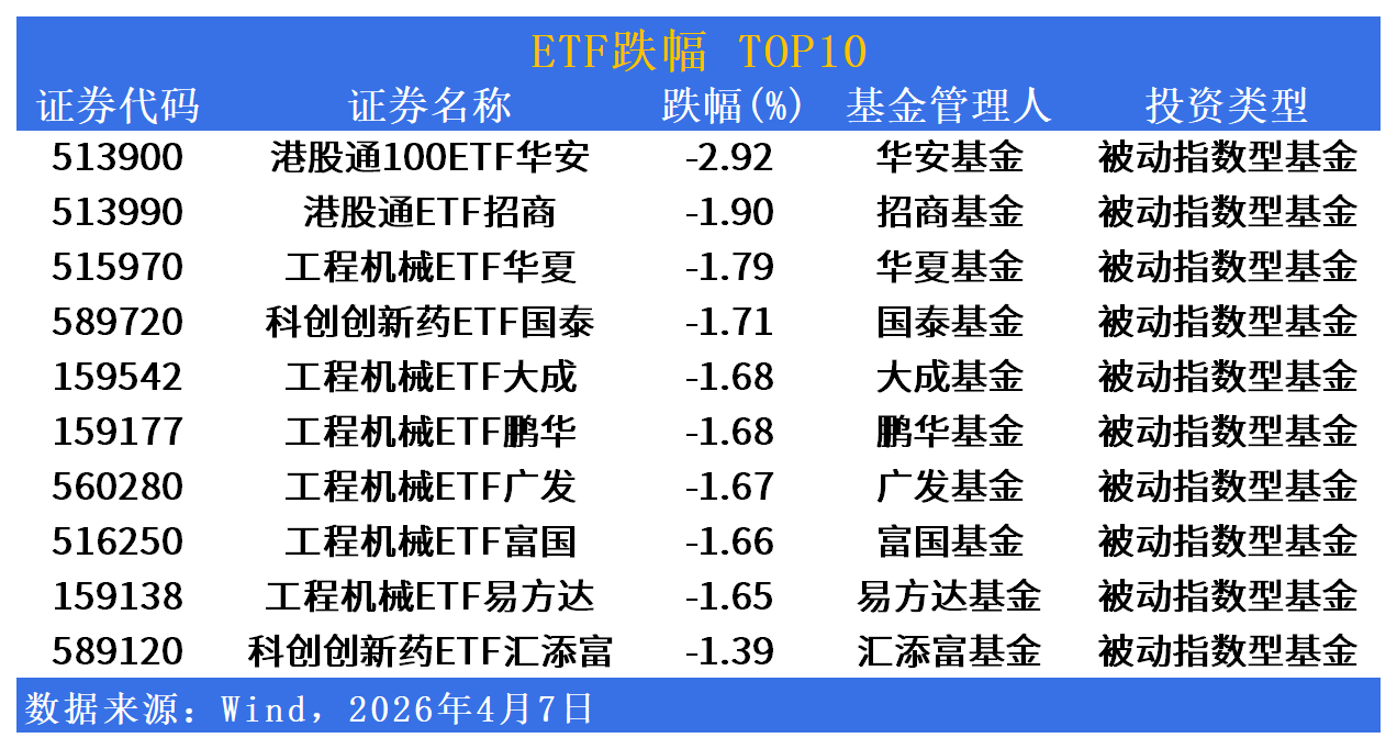 跌幅方面,港股通及工程机械板块小幅回调,科创创新药ETF小幅承压