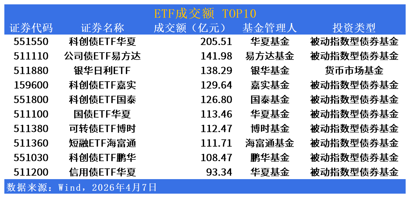 科创债ETF华夏(551550)单日成交205.51亿元居首,公司债ETF易方达(511110)成交141.98亿元,银华日利ETF(511880)成交138.29亿元,科创债ETF嘉实(159600)成交129.64亿元,科创债ETF国泰(551800)成交126.80亿元,国债ETF华夏(511100)成交113.46亿元,可转债ETF博时(511380)成交112.47亿元,短融ETF海富通(511360)成交111.71亿元。