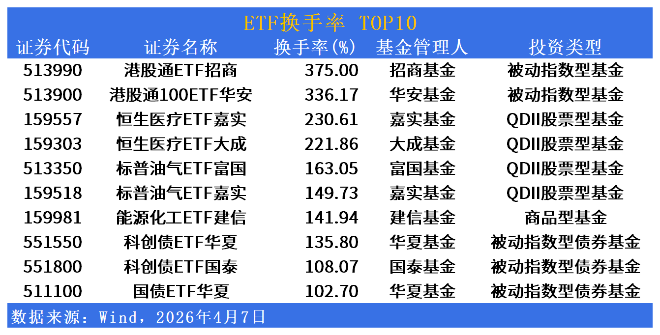 活跃度方面,科创债ETF成交205.51亿居首,港股通ETF换手率375%交投活跃