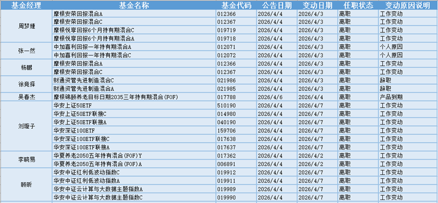 基金经理是一只基金产品最核心的成员,能决定一只基金的投资方向、投资策略以及投资风格,基金经理出色的择时选股能力和调研预测能力是基金业绩的有力保证,所以基金经理是投资者在选择基金产品时的重要依据。基金经理的变动很大程度上会影响到基金产品未来的表现,是一个需要特别关注的信息。4.4-4.7日共有22位基金经理发生任职变动。
