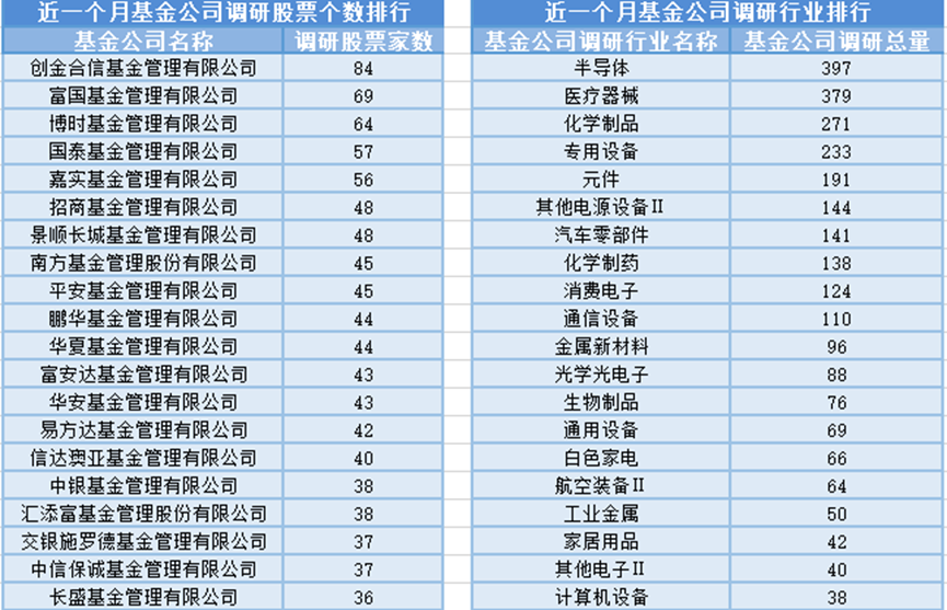 近一个月(3月8日-4月7日),创金合信基金参与公司调研的数量最多,共调研84家上市公司,此外调研较为活跃的还有富国基金、博时基金和国泰基金,分别调研69家、64家、57家上市公司;从调研行业上来看,基金公司对半导体行业的上市公司调研次数最多,共有397次,其次是医疗器械行业,基金公司调研了379次。
