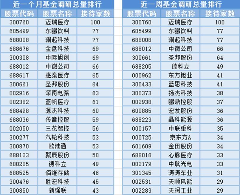将时间周期缩短到最近一周(3月31日-4月7日)来看,基金调研数量第一的公司是迈瑞医疗,迈瑞医疗属于医疗设备行业,主营业务为医疗器械的研发、制造、营销及服务。迈瑞医疗共被100家基金机构调研,其次被调研数量较多的股票是东鹏饮料、澜起科技和中微公司,分别接受77家、77家和66家基金机构的调研。