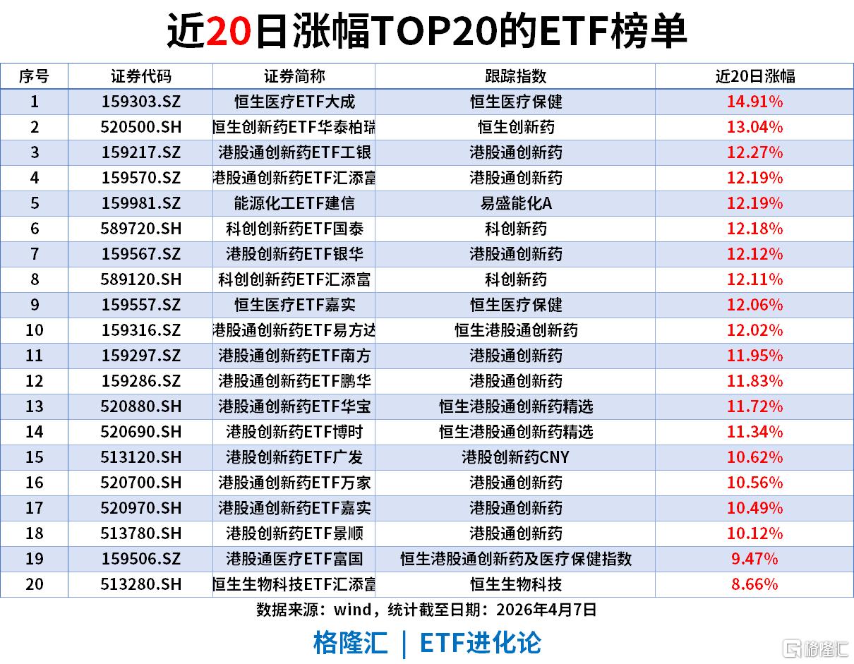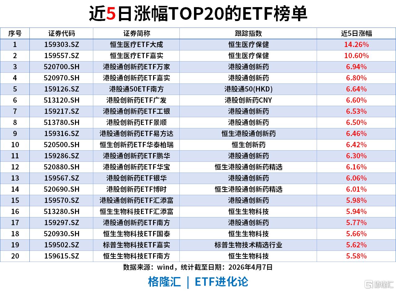 医疗创新药板块:恒生医疗ETF大成以14.91%涨幅登顶,港股通创新药、科创新药等相关ETF包揽榜单前19席,涨幅集中在9.47%-13.04%区间,医药成长成为中期最强风口,行情延续性极强。