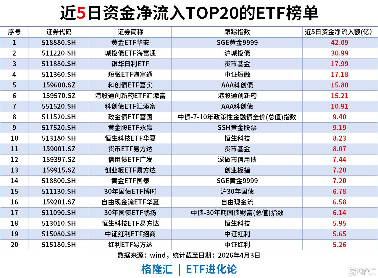 黄金资产:黄金ETF华安以42.09亿净流入遥遥领先,黄金股ETF、黄金ETF国泰等黄金相关品种合计流入超58亿,成为中期资金加仓的核心方向,地缘避险逻辑持续强化。