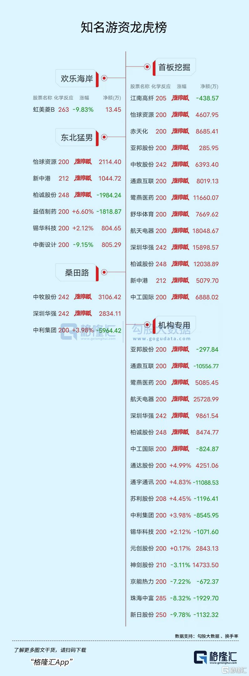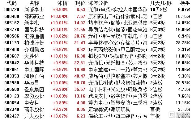 高位股方面,光纤概念股新能泰山10天8板,医药板块津药药业7连板,新中港5天4板,国晟科技6天3板,汇源通信3连板,柏诚股份、齐翔腾达等4天2板。