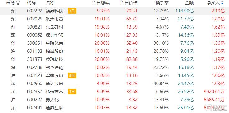 龙虎榜单日净买入额前三为航天电器、东岳硅材、深圳华强,分别为1.80亿元、1.62亿元、1.59亿元。