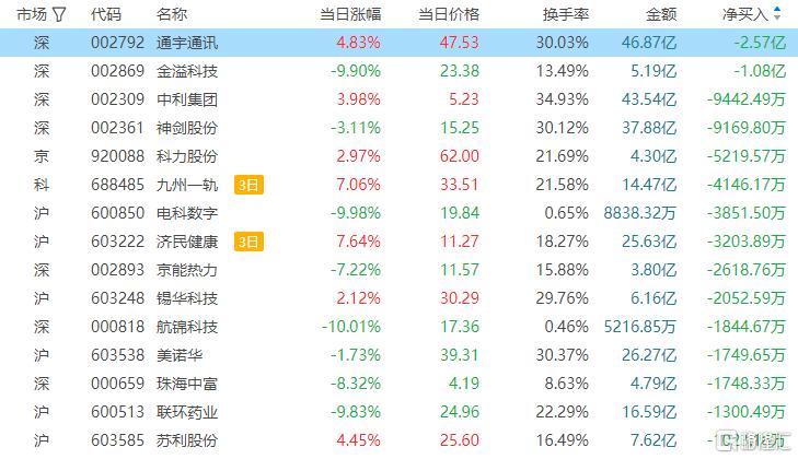 龙虎榜单日净卖出额前三为通宇通讯、金溢科技、中利集团,分别为2.57亿元、1.08亿元、9442.49万元。