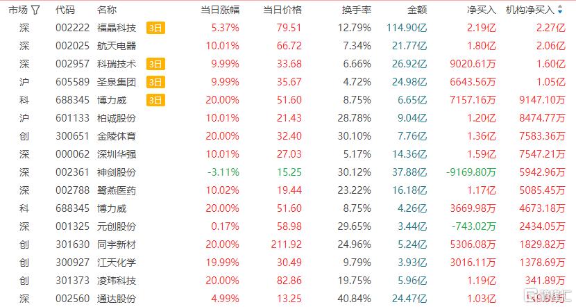 龙虎榜中涉及机构专用席位的个股中,当日净买入额前三为航天电器、柏诚股份、金陵体育,分别为2.06亿元、8474.77万元、7583.36万元。