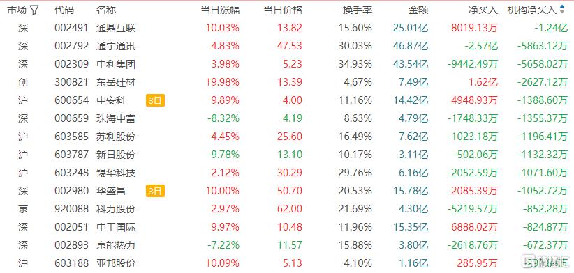 龙虎榜中涉及机构专用席位的个股中,当日净卖出额前三为通鼎互联、通宇通讯、中利集团,分别为1.24亿元、5863.12万元、5658.02万元。