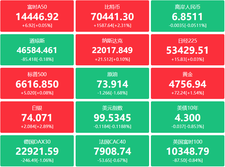 期货:现货黄金涨1.30%报4709.73美元,黄金期货涨1.11%报4737.80美元;现货白银涨0.28%报73.0205美元,白银期货涨0.48%报73.195美元;铜期货持平报5.5995美元,现货铂金跌0.98%,现货钯金跌0.79%;原油期货收涨0.54美元,涨幅0.48%报112.95美元;布伦特原油跌0.50美元,跌幅超0.45%报109.27美元;天然气期货报2.87美元,汽油期货报3.3052美元,取暖油期货报4.4774美元。