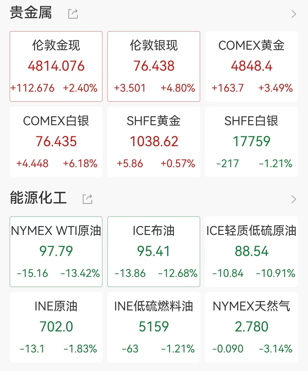 韩国交易所于KOSPI 200期货上涨5%后启动KOSPI指数熔断机制,程序化交易暂停5分钟。商品方面,金银大涨,现货黄金一度涨超3%,截至发稿涨2.4%报4814.076美元/盎司,现货白银一度涨近6%,截至发稿涨4.8%报76.438美元/盎司;原油大跌,WTI原油一度跌超19%,截至发稿跌13.42%报97.79美元/桶,布油一度跌超16%,截至发稿跌12.68%报95.41美元/桶。