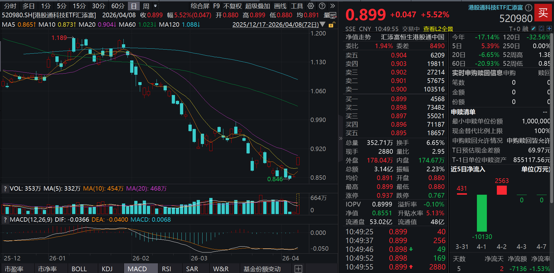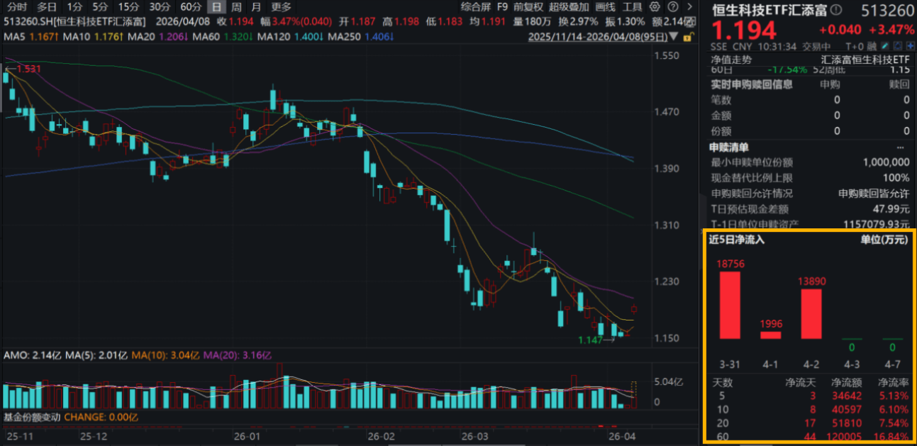 100%纯度的港股通科技ETF汇添富(520980)放量大涨超5.5%,成交额飙升至3.2亿元!同类唯一15BP最低档管理费的恒生科技ETF汇添富(513260)涨超3%!