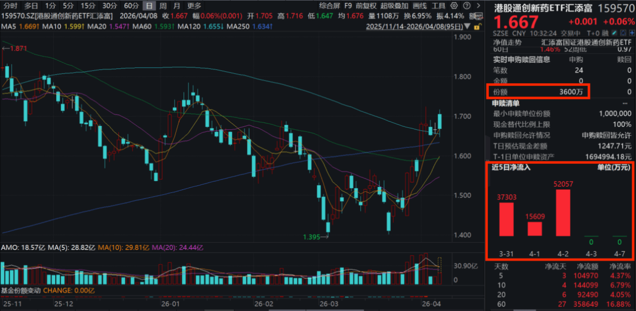 创新药纯度100%的港股通创新药ETF汇添富(159570)再度飘红,成交额再度狂飙盘中快速突破21亿元,资金连续第四天狂涌(排除港股休市日),盘中再度涌入超6000万元,4日累计“吸金”超11亿元!最新规模超269亿元,全市场创新药类ETF领先!