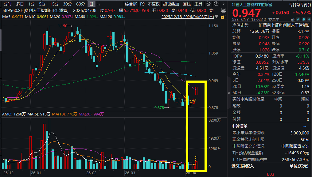 4月8日,地缘局势释放缓和信号,前期承压的科技主线强劲反弹!截至13:01,科创芯片ETF汇添富(588750)、科创人工智能ETF汇添富(589560)高开高走,双双涨超5%!