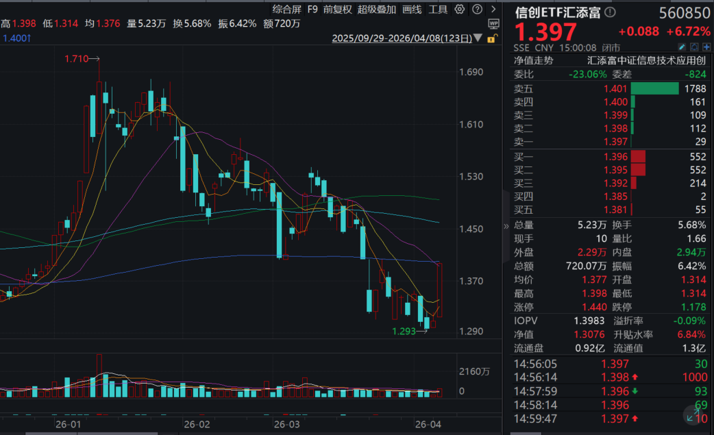 今日(4.8),A股强势反弹,量能明显放大,沪指逼近4000点。“AI应用”含量更高的软件ETF汇添富(159590)收涨7.06%,全天成交额超4300万元!信创ETF汇添富(560850)收涨6.72%!