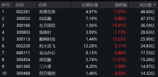 软件ETF汇添富(159590)标的指数成分股多数收红:东方国信涨超15%,顺网科技涨超13%,深信服涨超11%,同花顺涨超8%,拓维信息、指南针涨超7%。