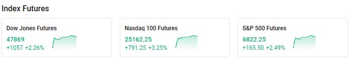 截至美东时间上午4:15,美股三大股指期货全线大涨,标普500指数期货上涨2.59%,纳斯达克100指数期货上涨3.25%,道琼斯指数期货上涨2.26%。