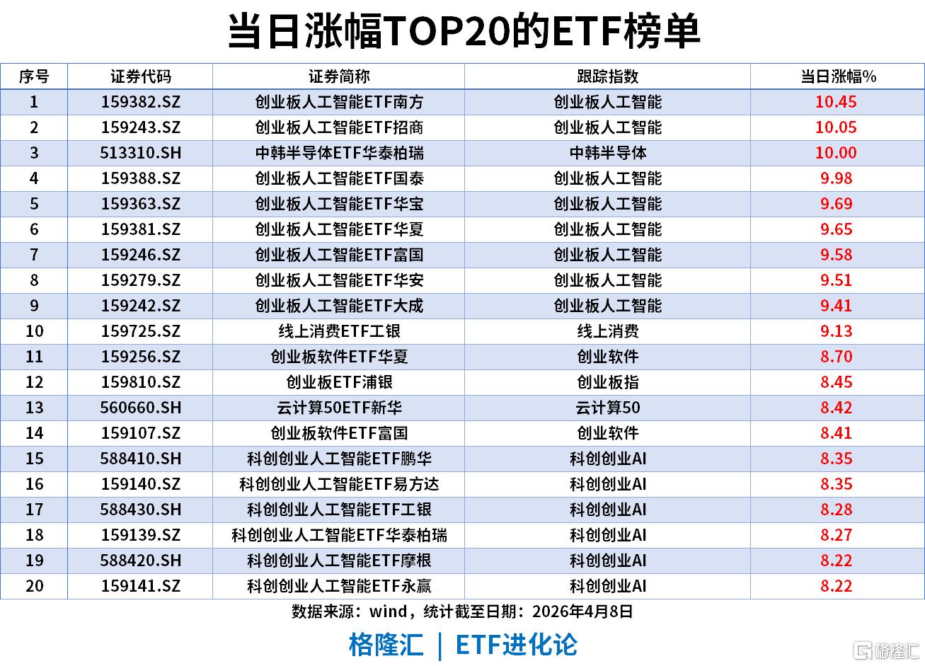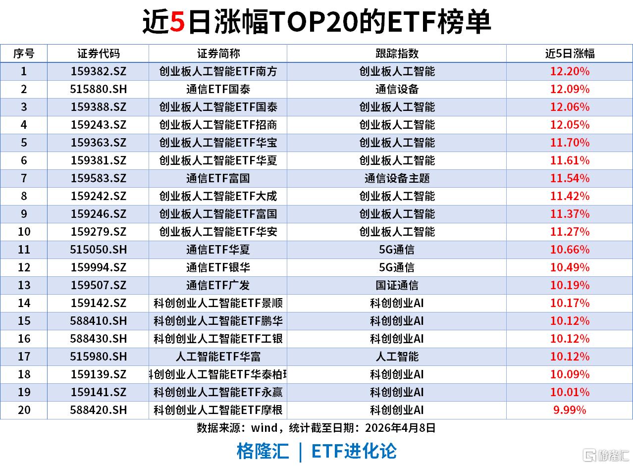 通信板块:通信设备、5G通信、国证通信等通信全产业链ETF批量录得10.19%-12.09%涨幅,通信ETF国泰以12.09%位列第二,与AI形成双轮驱动,科技成长风格全面占优。