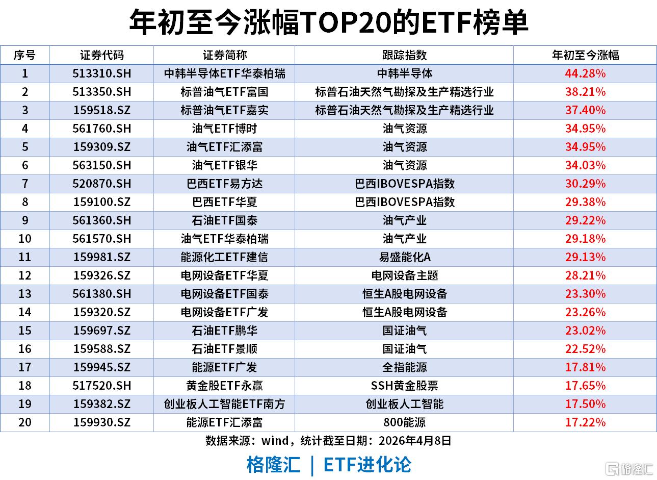 油气资源、能源化工、电网设备、石油等能源全产业链ETF批量收获17%-35%涨幅,巴西ETF等全球资源品也进入榜单,创业板人工智能ETF仅以17.50%位列第19,为阶段性行情,未改变年度能源主导的格局。