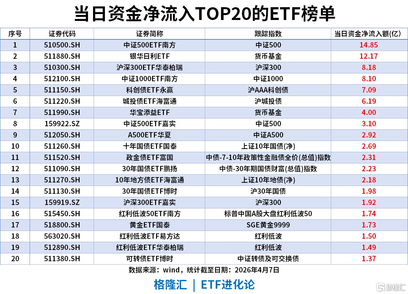 宽基指数:中证500ETF南方以14.85亿净流入领跑,叠加中证500ETF嘉实、沪深300、中证1000等核心宽基,合计流入超30亿,成为当日资金核心配置方向。