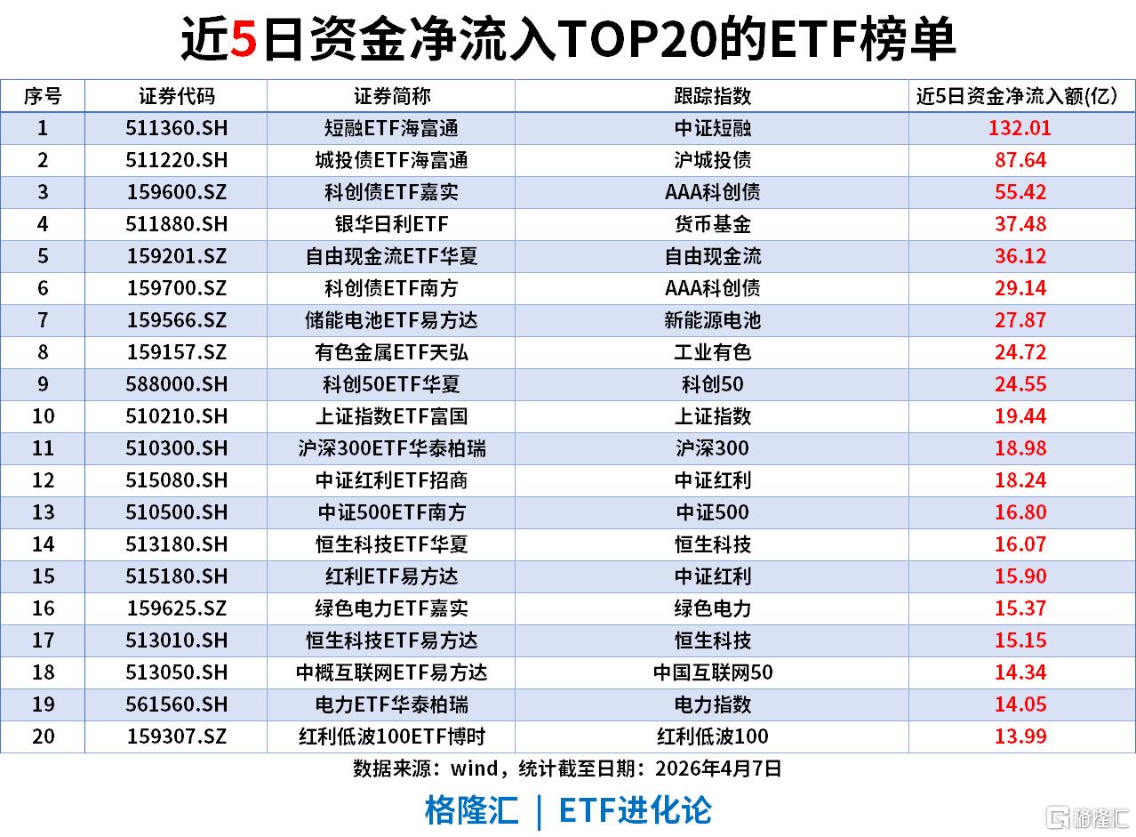 固收类资产:短融ETF海富通以132.01亿净流入遥遥领先,城投债ETF海富通、科创债ETF嘉实等固收品种合计流入超270亿,低风险资产成为中期资金“压舱石”。