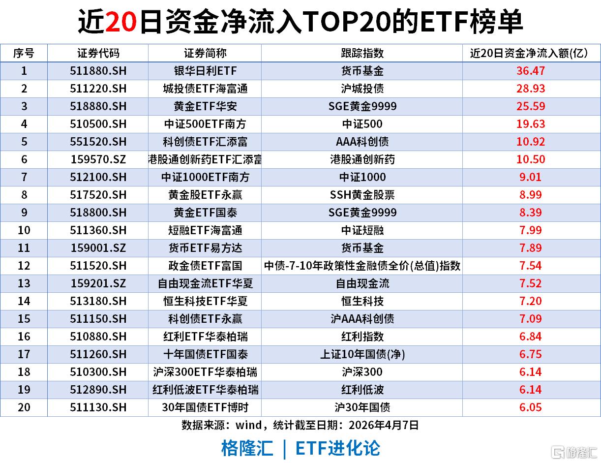 货币与固收:银华日利ETF以36.47亿净流入登顶,城投债、短融、国债等固收品种合计流入超70亿,提供稳定配置基础。