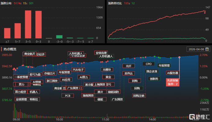 4月8日,A股三大指数集体上涨,全市场成交额2.45万亿元,较前一交易日增量8271亿元。板块方面,贵金属、AI应用、CPO概念等板块走强;油气、煤炭、医药商业等板块下挫。