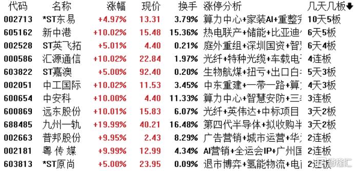 高位股方面,*ST东易10天5板,新中港6天5板,ST英飞拓6天4板,汇源通信4连板,ST嘉澳5天3板,中工国际4天3板,中安科3连板。