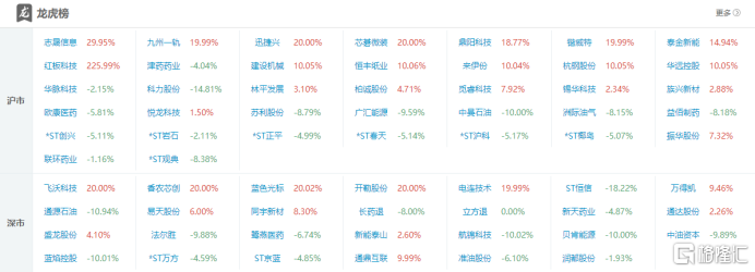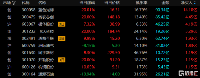 龙虎榜单日净买入额前三为蓝色光标、香农芯创、飞沃科技,分别为14.1亿元、4.45亿元、3.29亿元。
