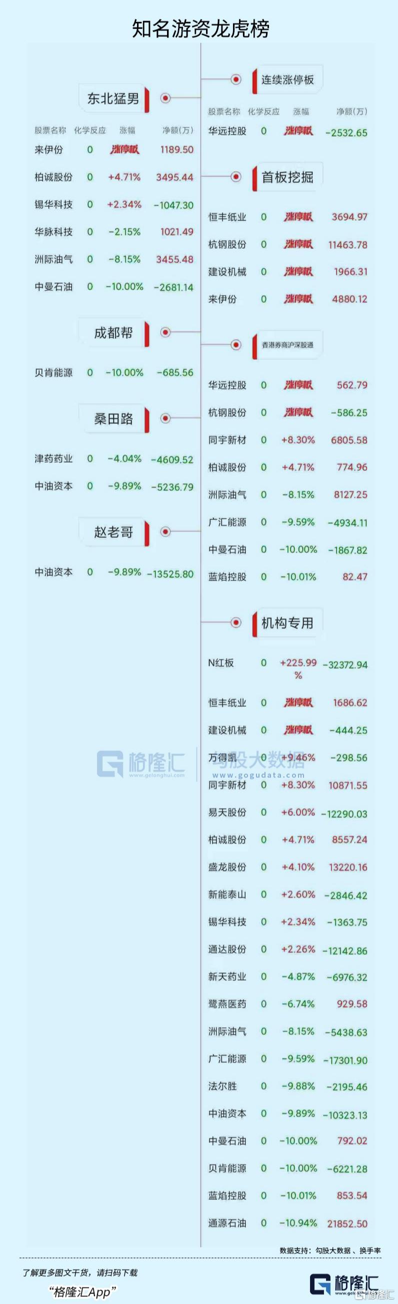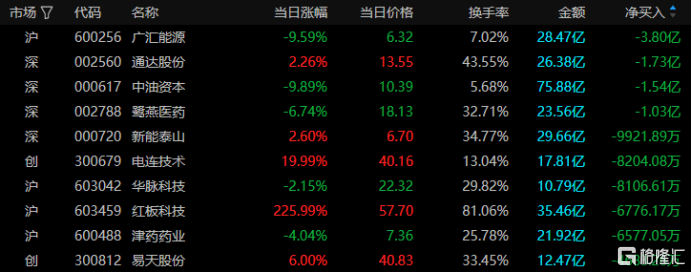 龙虎榜单日净卖出额前三为广汇能源、通达股份、中油资本,分别为3.8亿元、1.73亿元、1.54亿元。