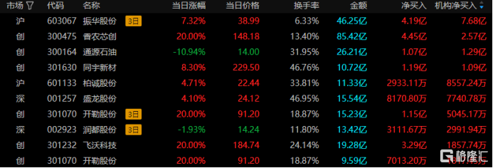 龙虎榜中涉及机构专用席位的个股中,当日净买入额前三为香农芯创、通源石油、同宇新材,分别为2.57亿元、1.29亿元、1.09亿元。